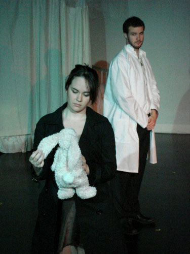 THE BALTIMORE WALTZ by Paula Vogel Directed by Gary Jaffe OCTOBER 11 - 13, 2007 at the Off Broadway Theatre presented by the Yale University Sudler Fund The Baltimore Waltz was my first full-length play as director, and it helped me discover what I value in theater: deeply personal storytelling, the ability to blur fantasy and reality, and tender, funny, beautiful things emerging from even the darkest emotional places. The play is a valentine from the playwright to her brother, whom she lost to HIV/AIDS. The Baltimore Waltz deals with her immediate denial of his death, as she envisions the tour through Europe which they never took together, alternating the cold sterility of a hospital room in Baltimore with a sumptuous fantasy Europe, albeit dogged by a noir-ish Third Man character. The Baltimore Waltz takes the significant images of her brother's death (his doctor, his stuffed rabbit, his bed, his illness), and kaleidoscopes them into a maddening, hilarious, and heartbreaking enactment of the sister's internal experience. Featuring: Christine Garver, Lee Seymour (both featured left), Cory Finley, Jo-Jo the Rabbit. Scenic Design by Samo Gale; Lighting Design by S.B.K. Weintraub; Costume Design by Anna Aleksandrova |
