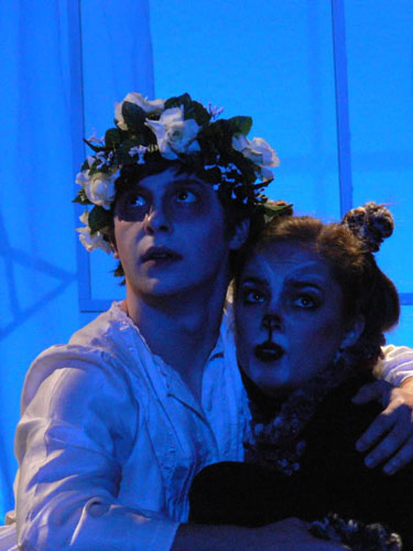 ONCE FIVE YEARS PASS by Federico García Lorca in a new translation by Gary Jaffe directed by Gary Jaffe OCTOBER 22 - 24, 2009 at the Whitney Theatre a Yale Theatre Studies Senior Thesis for Gary Jaffe & Bobby Foley In Once Five Years Pass, a young man contemplating suicide imagines the ways his life might play out, enacting the fragmentation of his possible selves onstage, weaving the experience with fragments of memories—the death of neighborhood boys and cats—and fantasies. As the director of this beautiful but bewildering piece, I used strategic staging to clarify the central storyline. I decided that the Young Man would never truly leave his house. With only a few shifts—removing a window, hanging fabric trees, shifting furniture—his house became a different space entirely—a balcony, a forest—while remaining fundamentally the same. I cast the play similarly, having actors double in both recognizable and bizarre roles. This doubling created a theatrical experience at once outlandish and heartbreakingly real. The audience, following the the final evening of a young man's life, encountered the wonderfully strange and the achingly familiar. Featuring: Bobby Foley, Erin Capistrano, Daniel Amerman, O'Hagan Blades (both pictured left), Jacob Liberman, Will Turner, Rafa Kern, Adriel Saporta Scenic Design by Rachel Sturm; Lighting Design by Lauren Bremen; Costume Design by Zoelle Egner, Elizabeth Palazzolo and Gary Jaffe |